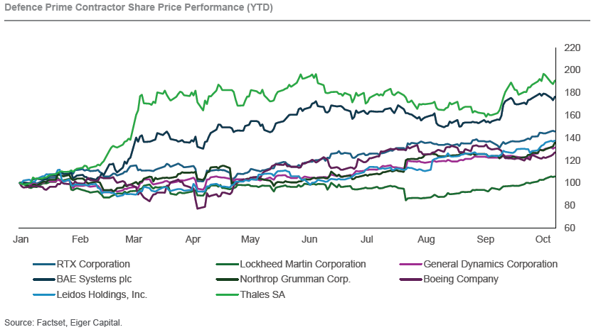 Heightened geopolitical risks have prompted the EU to be more receptive to aligning the global defence budget with US President Trump’s suggestion that NATO members lift defence spending from c.2% of GDP to 3.5%. The US leads the world in defence spending at 3.4% of GDP, which for decades has perpetuated their defence industry’s superiority. The US prime contractors are incumbents for defence contracts globally and often muscle out local defence hopefuls for contracts. Trump’s spending demands now come with a real consequence as the Ukrainian conflict is beginning to intrude on NATO member territory, reigniting focus on domestic defence spending. Since the beginning of the year these global defence primes are up on average 60%.
